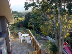 ベランダからは 緑が真近に眺められます。 お風呂はもちろん天然温泉。 お散歩はペンションのすぐ裏の林の小道で